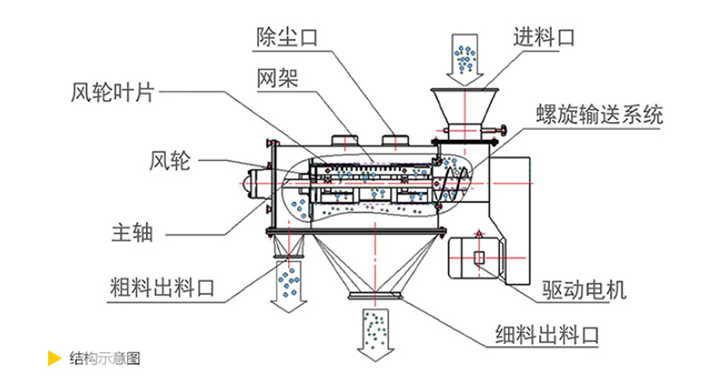 離心式篩分機(jī)從外觀上看上部為水平放置的圓柱形、下部為圓錐形的密閉容器,篩機(jī)下面有支腿以支撐整個(gè)篩機(jī)。電機(jī)通常位于設(shè)備頂部或底部,通過(guò)皮帶或直接驅(qū)動(dòng)主軸。進(jìn)料口通常在筒的一端或頂部,物料通過(guò)管道或漏斗送入。出料口有兩處,一處是細(xì)顆粒出口,一處是大顆粒出口,一般在筒的另一端或筒側(cè)面。